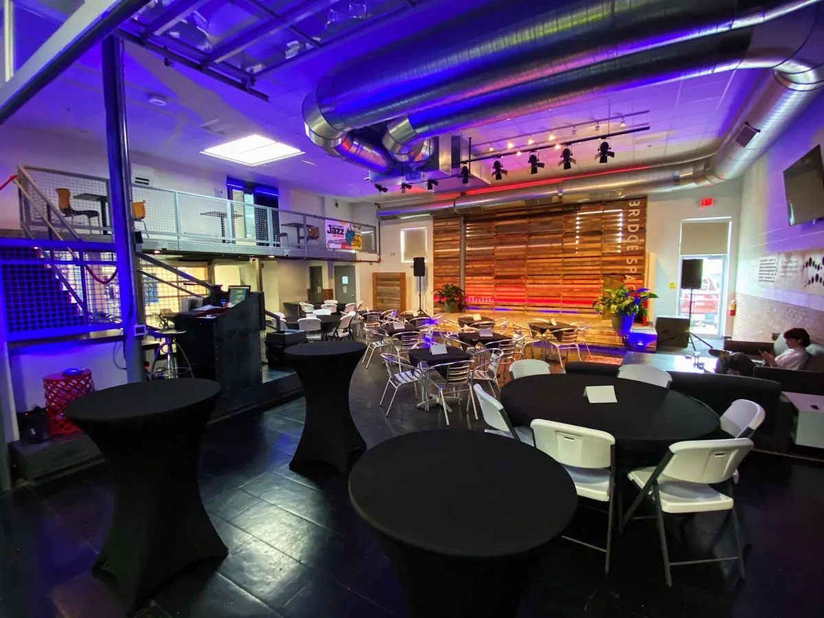 Step into a modern industrial feel with high ceilings, open space, and flexible layouts. Tables, chairs, and pro AV equipment are built into the space — perfect for any event setup.